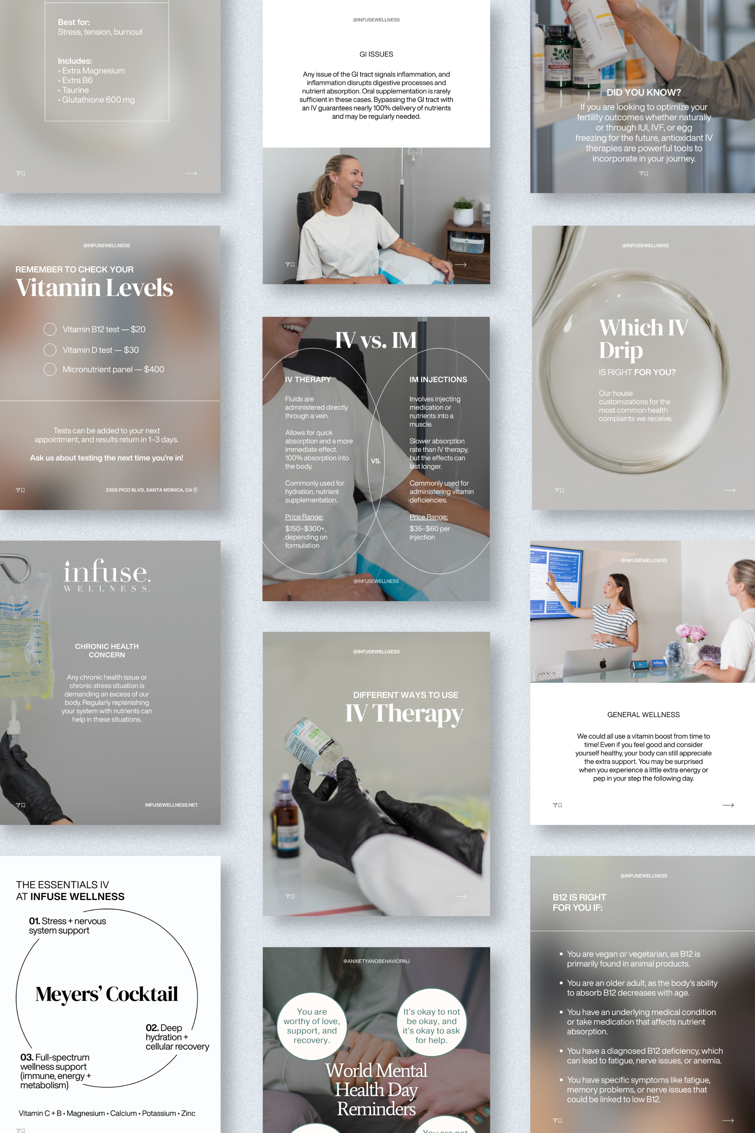 Create social media strategy for Infuse Wellness — a med-spa offering anti-aging, IV therapy and regenerative treatments. The work focused on a clean, approachable tone that reflects their science-informed approach and builds trust.