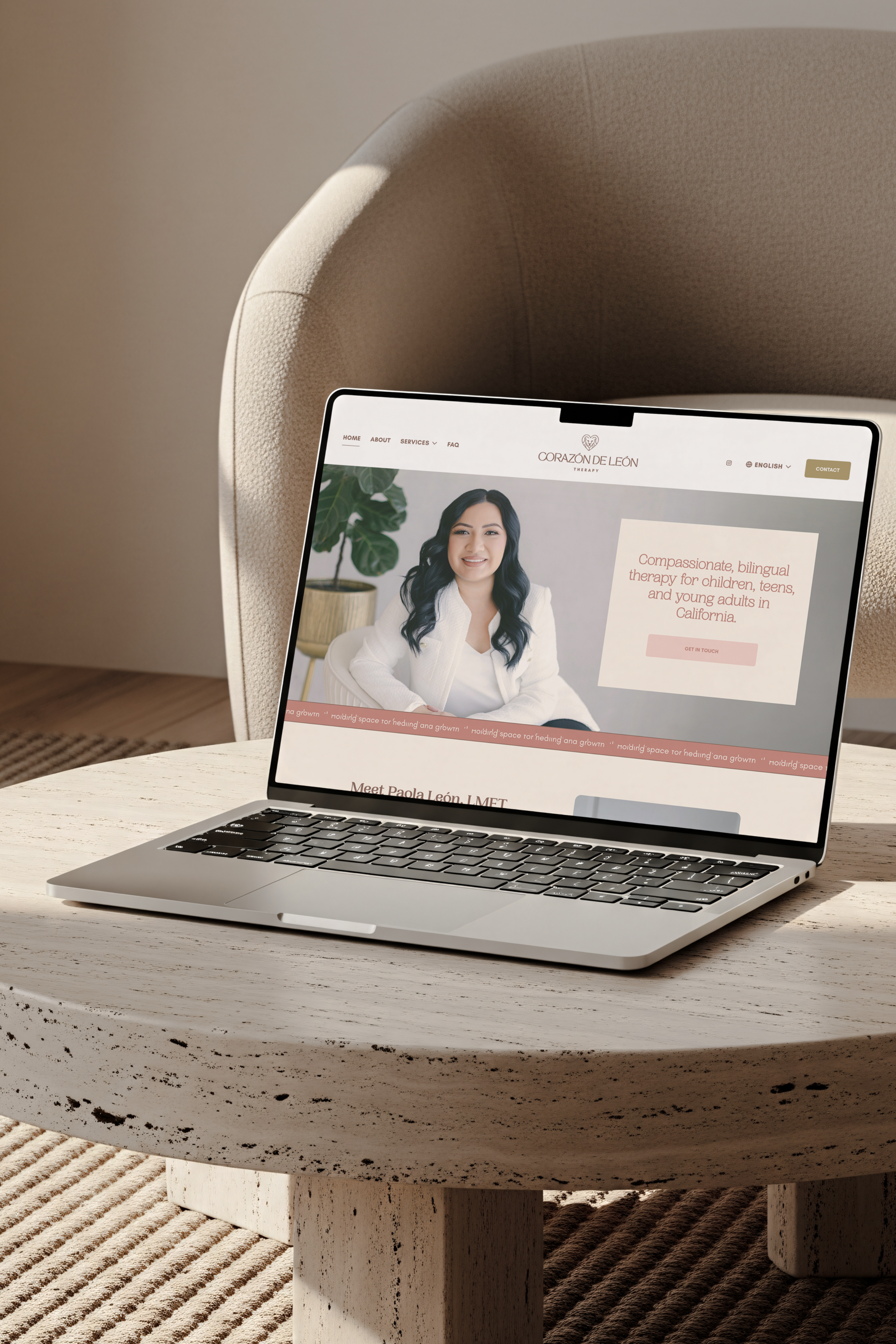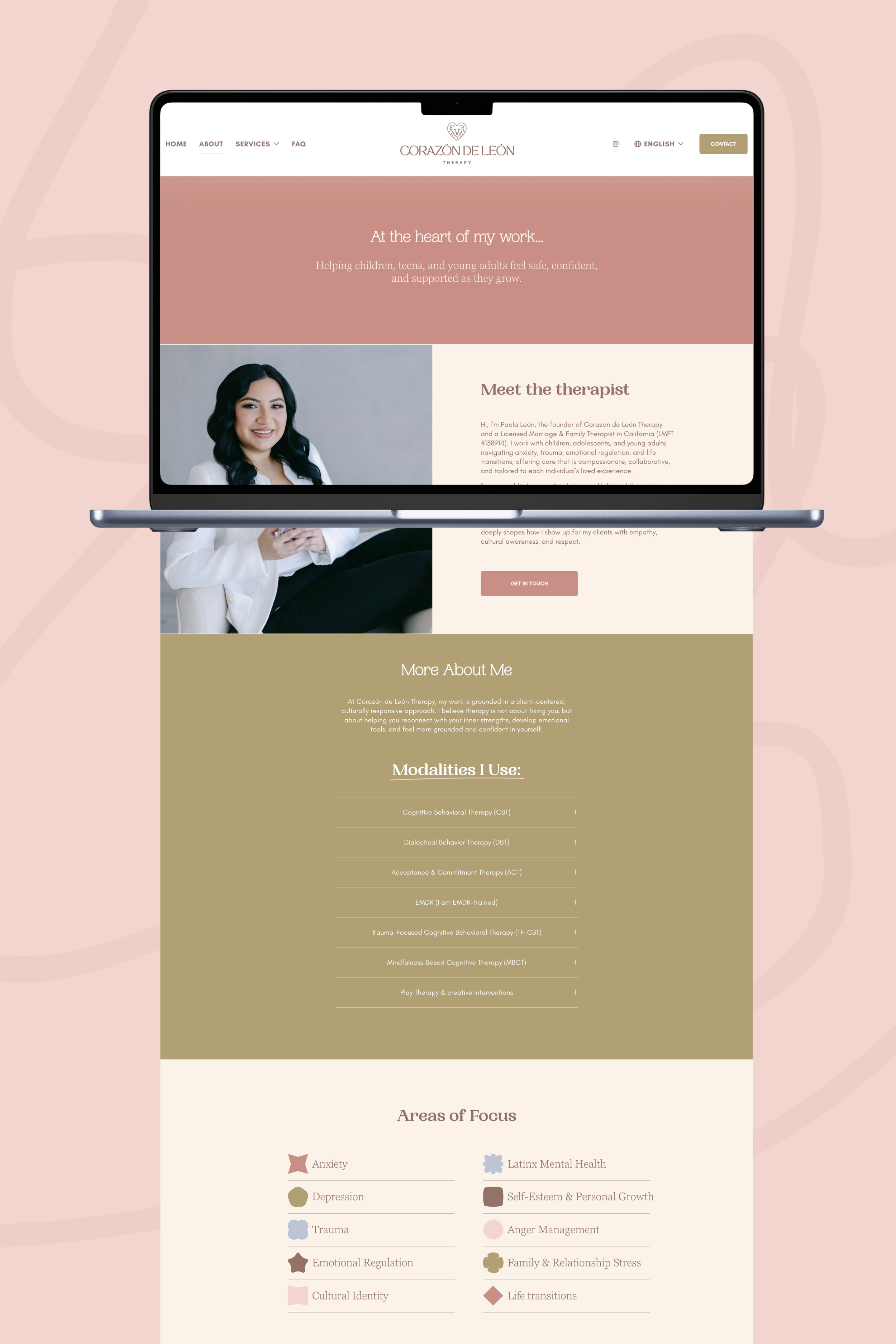 Shape the brand identity and website for Paola León, LMFT (Corazón de León Therapy) — a licensed therapist specializing in trauma, attachment, and relational healing. The work translated her empathetic, culturally conscious approach into a warm, cohesive, and trustworthy digital presence.